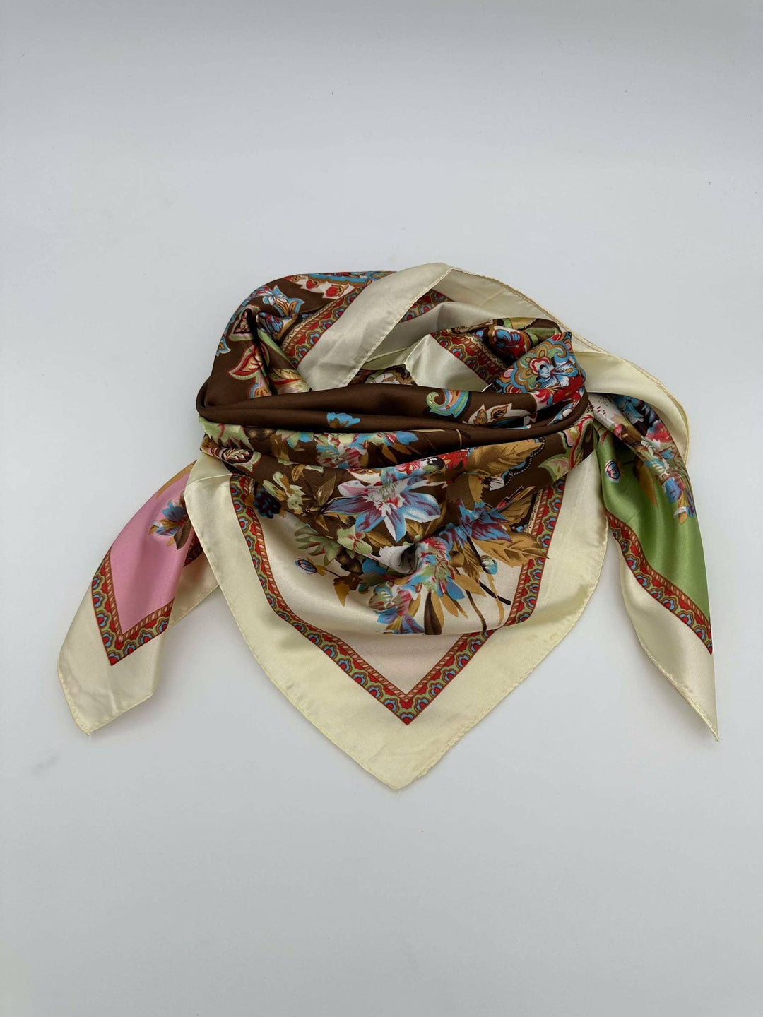 Brown & Pastel Four Corner Floral Silk Scarf