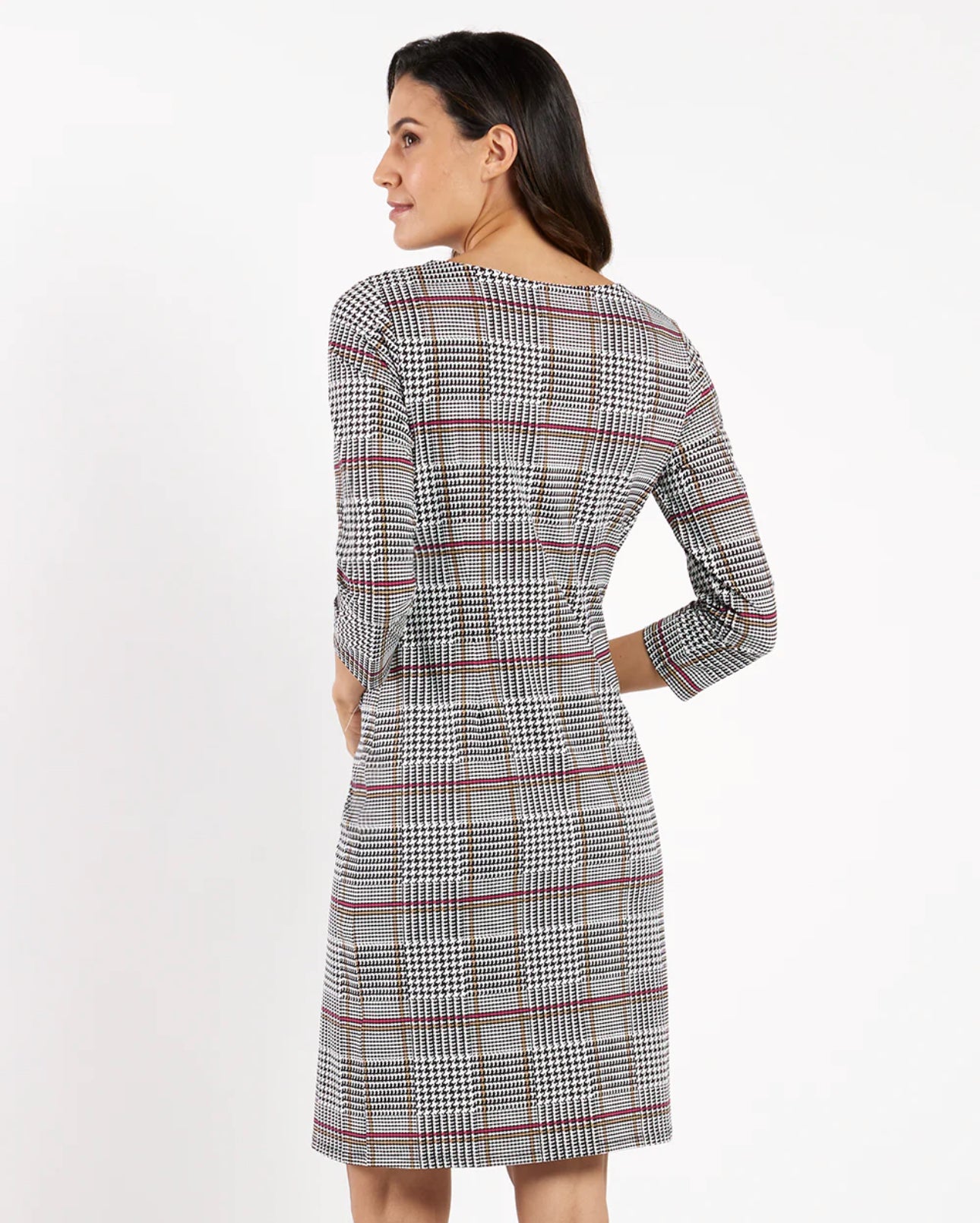 Say hello to Sabine! A true wardrobe classic. This shift dress features a polished crew neckline, flattering 3/4 sleeves, and our signature JC gold button detailing for an added touch of elegance. A timeless style that is fit for any occasion.