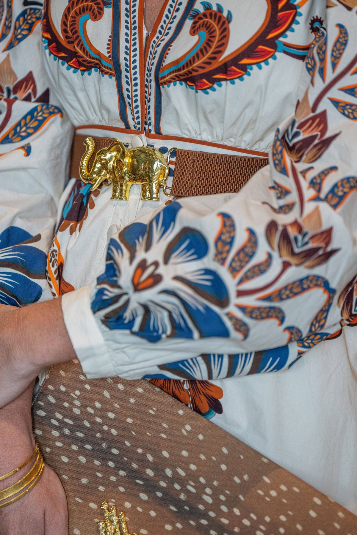 * Charming design featuring an elephant motif symbolizing good luck and positivity (3.5"x2"). * Interchangeable and versatile, compatible with our stretch belt bands. * Premium craftsmanship from zinc alloy with a protective coating for lasting brilliance. ** Belt Bands are sold separately.** The Elephant Artisan Belt Buckle combines elegance and good fortune with its beautifully detailed elephant motif. Expertly crafted from durable zinc alloy with a radiant metallic gold-tone finish, this buckle adds a whimsical yet sophisticated touch to any outfit.