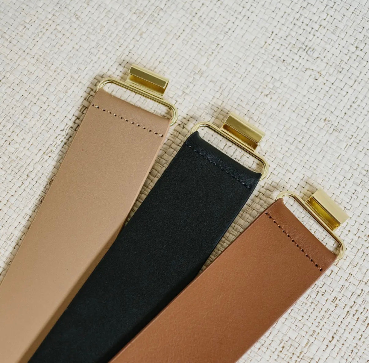 Sophisticated style meets comfort- the leather version of our signature stretch belt includes a blended stretch panel along the back that allows the band to function similarly to our classic stretch bands, and work interchangably with all of our buckles - while presenting as a classic leather belt!
