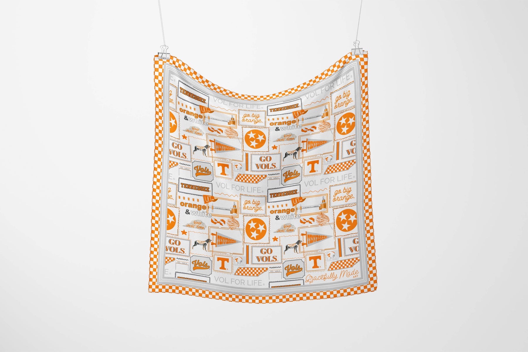 OFFICIALLY LICENSED BY THE UNIVERSITY OF TENNESSEE Wrap yourself in Volunteer spirit with our University of Tennessee silk scarf. Featuring hand-illustrated designs that celebrate game day traditions—like Smokey, Neyland Stadium, and the iconic orange & white—this scarf is both timeless and spirited. Made from luxuriously soft silk, it’s perfect for dressing up on game day, gifting to a proud Vols fan, or adding a touch of Tennessee pride to your everyday style. 24x24 inches Packaged with a branded tag and holographic sticker. UT, game day, fit, outfit, sorority, accessory, fall, collegiate, Smokey, Go Vols, orange, checkerboard