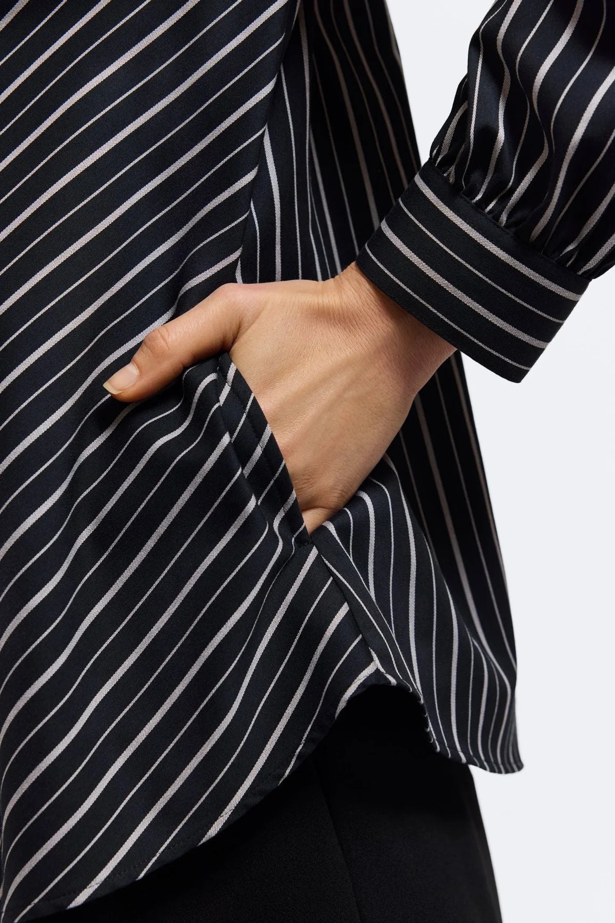 Sophisticated and modern, the Daphne Striped Popover Shirt is a timeless wardrobe essential with a contemporary twist. Designed with clean vertical and diagonal stripe detailing, this blouse elongates the silhouette while adding a touch of elegance. The popover style features a flattering split neckline, long sleeves with button cuffs, and a relaxed fit that drapes beautifully on the body.