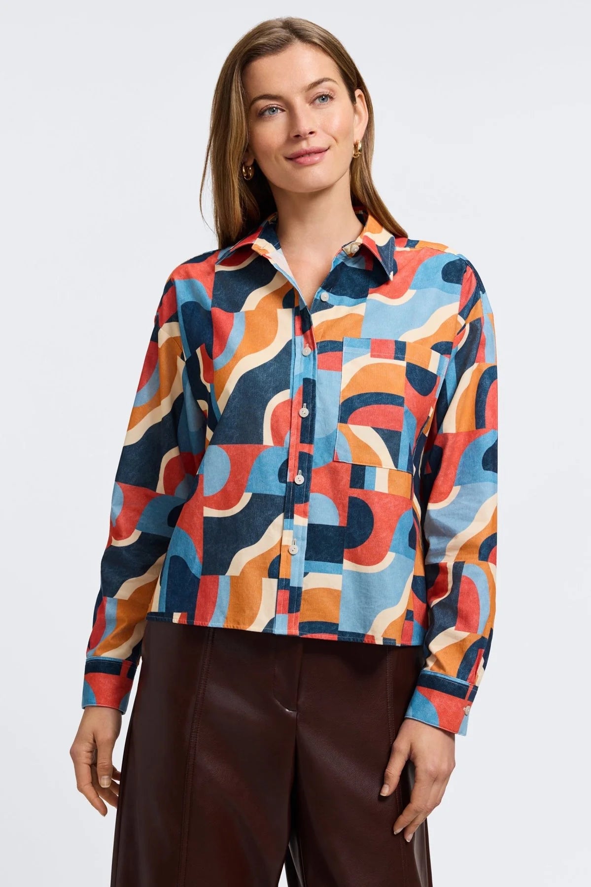 Make a bold statement with our Marina Corduroy Shirt. Crafted from soft, fine-wale corduroy, this shirt combines retro-inspired design with modern tailoring. Featuring a vibrant geometric print in shades of blue, orange, red, and cream, it’s the perfect piece to add personality to your wardrobe. The short silhouette, collared neckline, and button-front closure make it both stylish and versatile—ideal for pairing with high-waisted trousers, skirts, or denim.