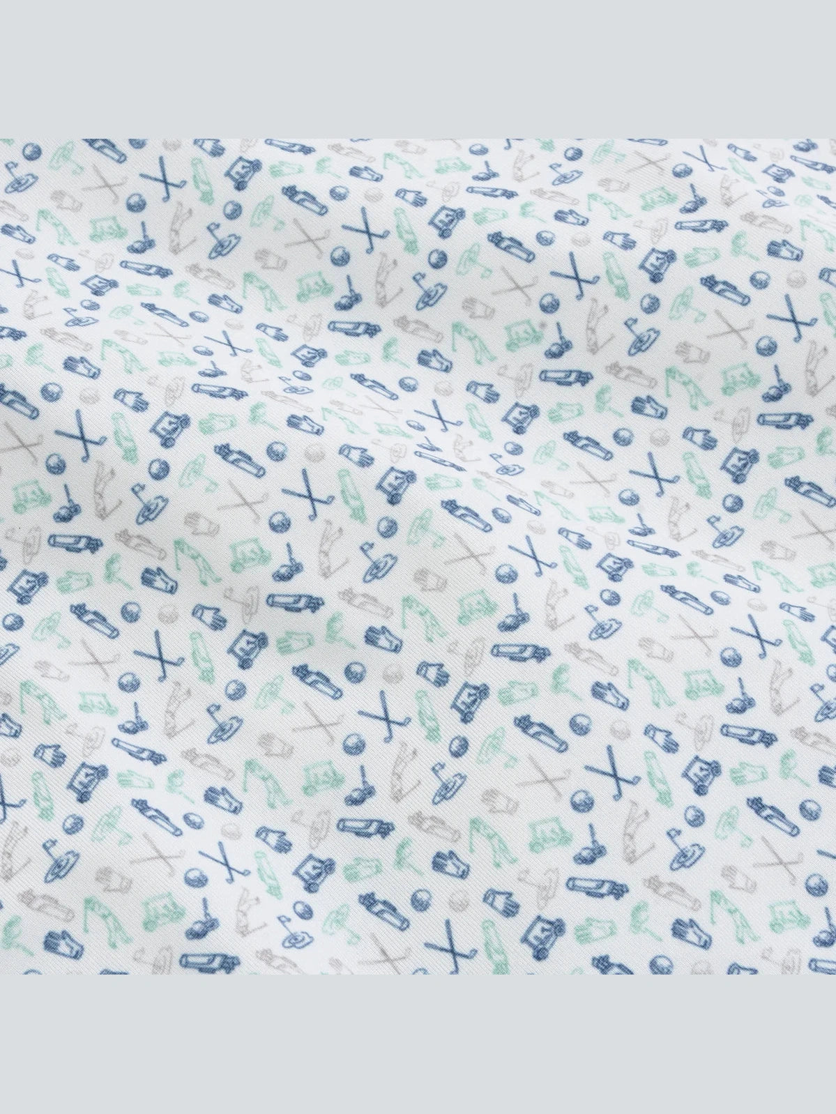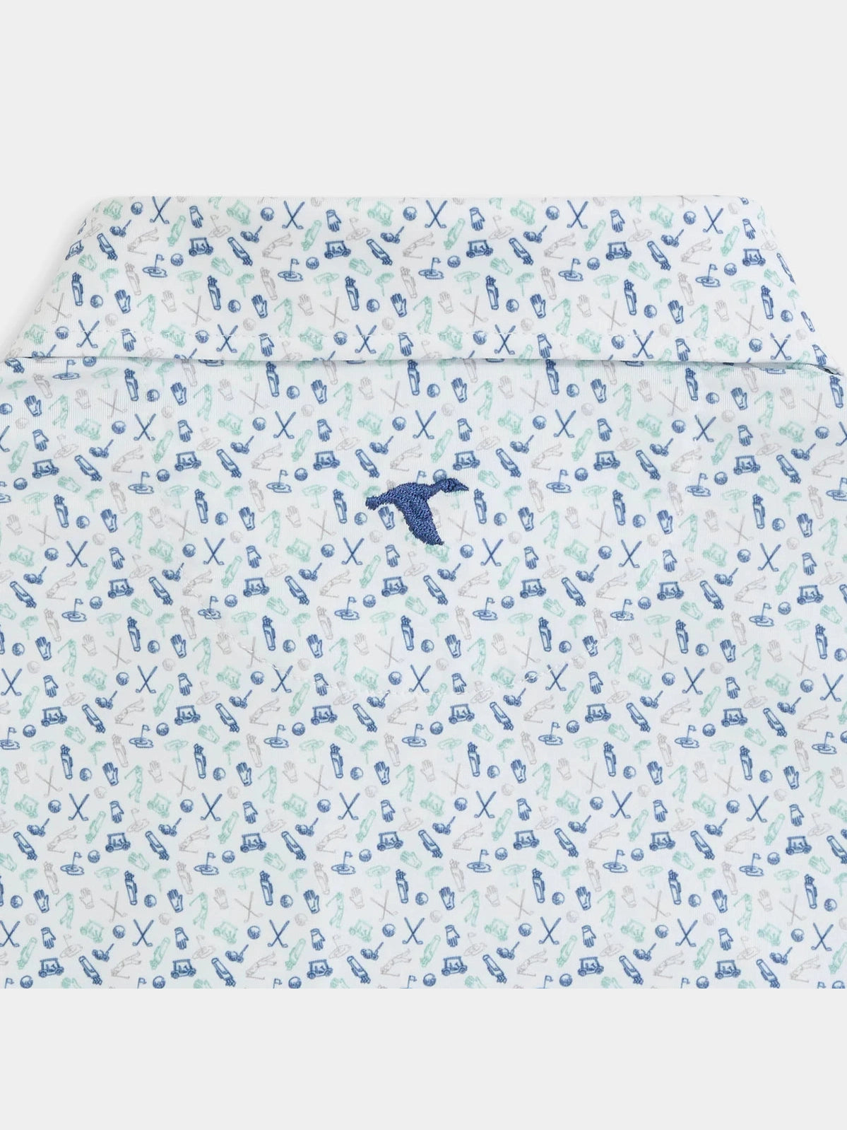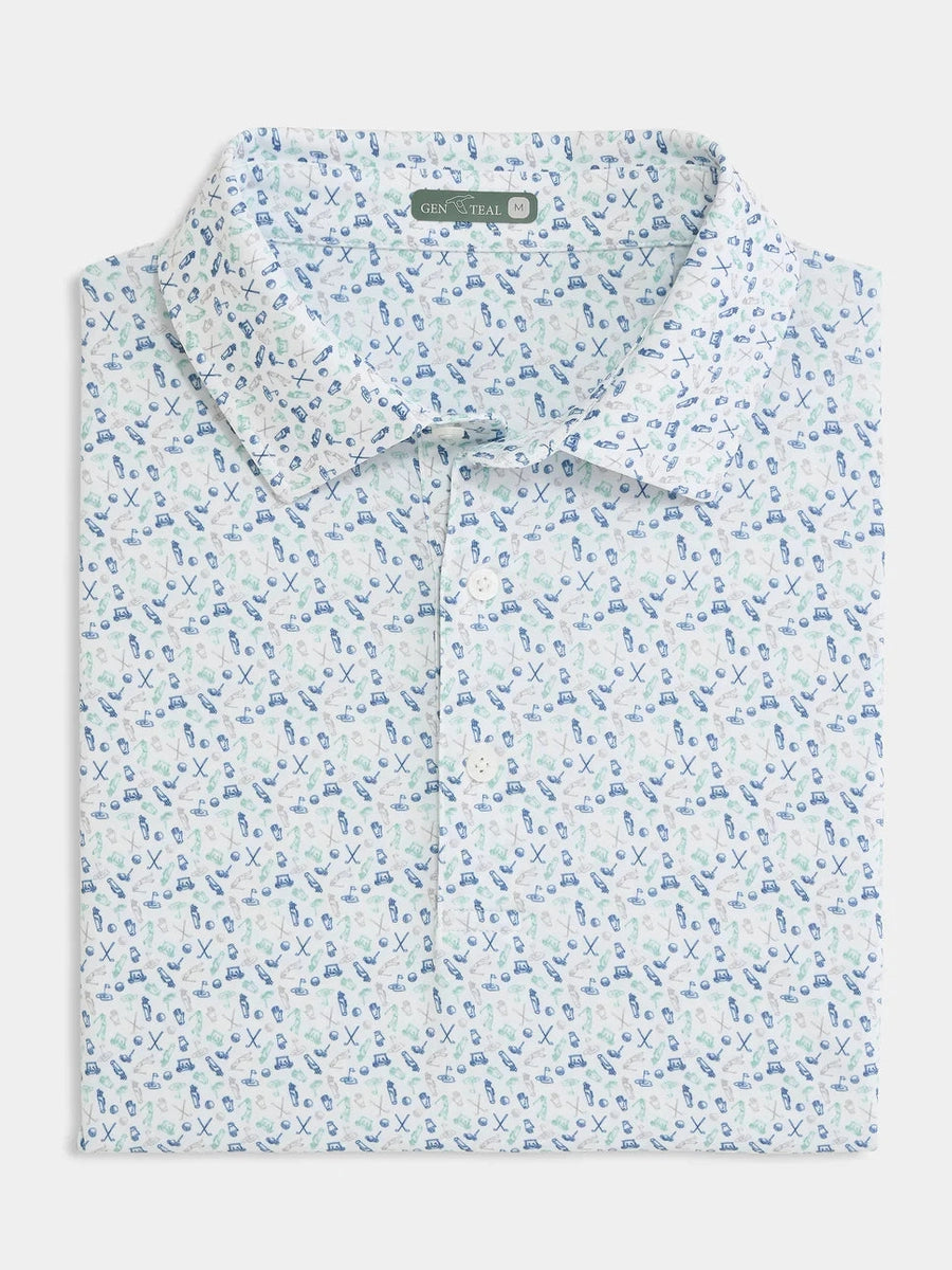 The Caddie’s Choice Printed Polo features golf essentials, from gloves and pins to clubs, bags, and a golfer silhouette.