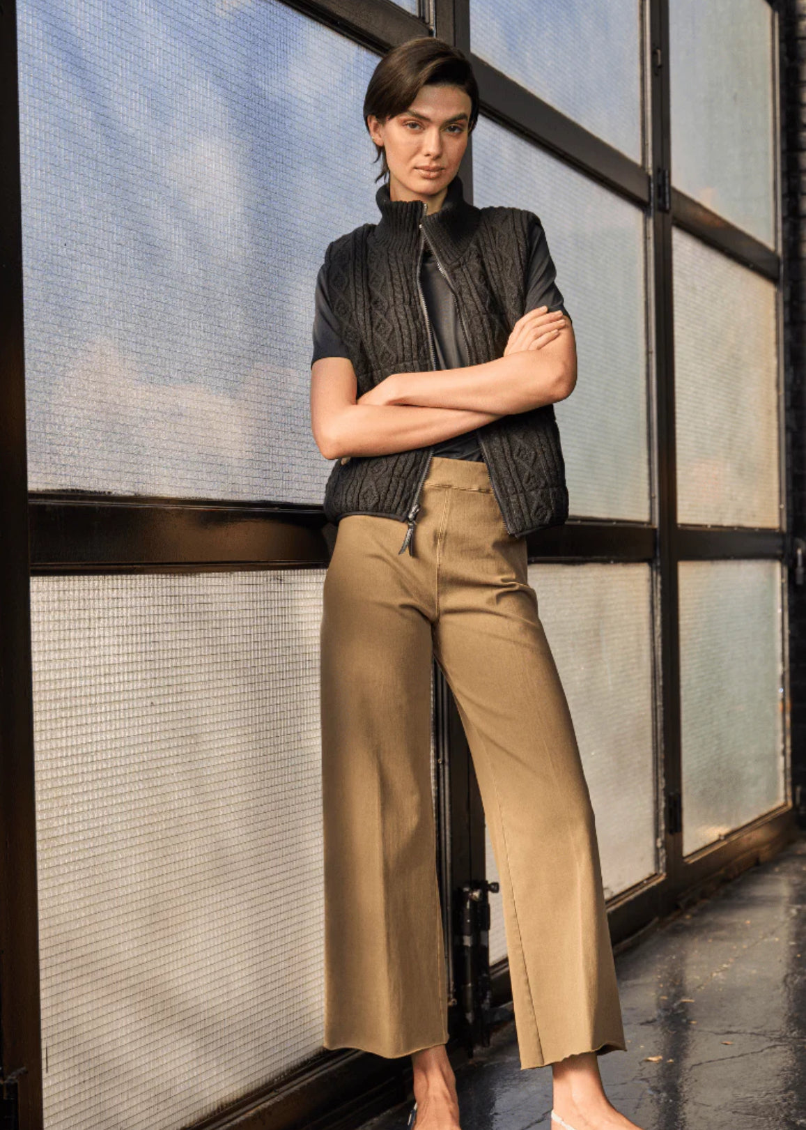 Made from 4-way stretch Knit Denim, these high-waisted, wide-leg jeans feature a concealed patented waistband, back patch pockets with gunmetal studs, beltloops and topstitching. Offering an extra-wide leg without side seams, the Erin High Waist Wide Leg Denim showcases a cropped, ankle length and raw-edge hem that’s simple to shorten. Style these wide-leg jeans with Larissa Satin Jersey Top, Lilith Cardigan Sweater and ankle booties.